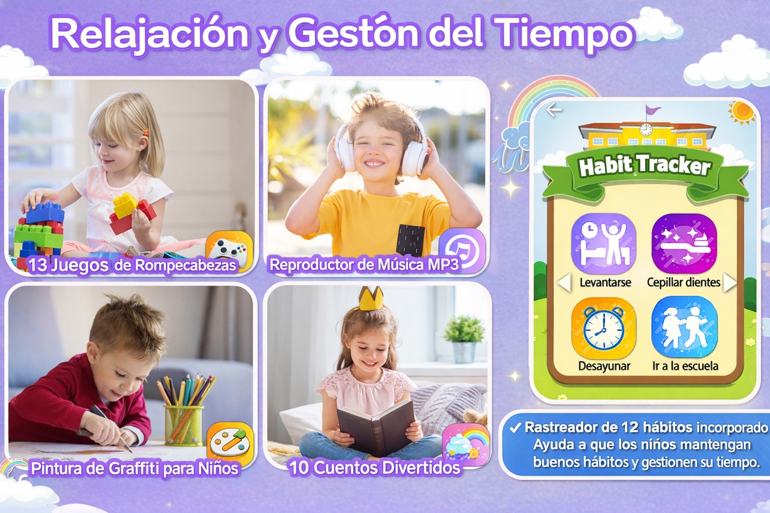 - Incluye cuentos para dormir y música relajante que ayudan a: